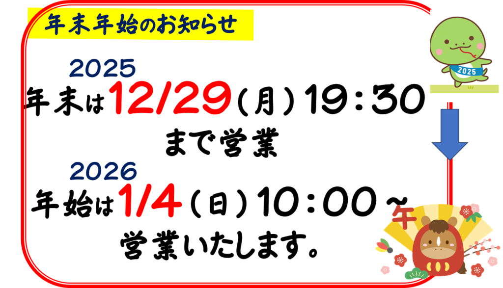 誠に勝手ながら、12月30日(火)~1月3日(土)まで年末年始のお休みをいただきます。