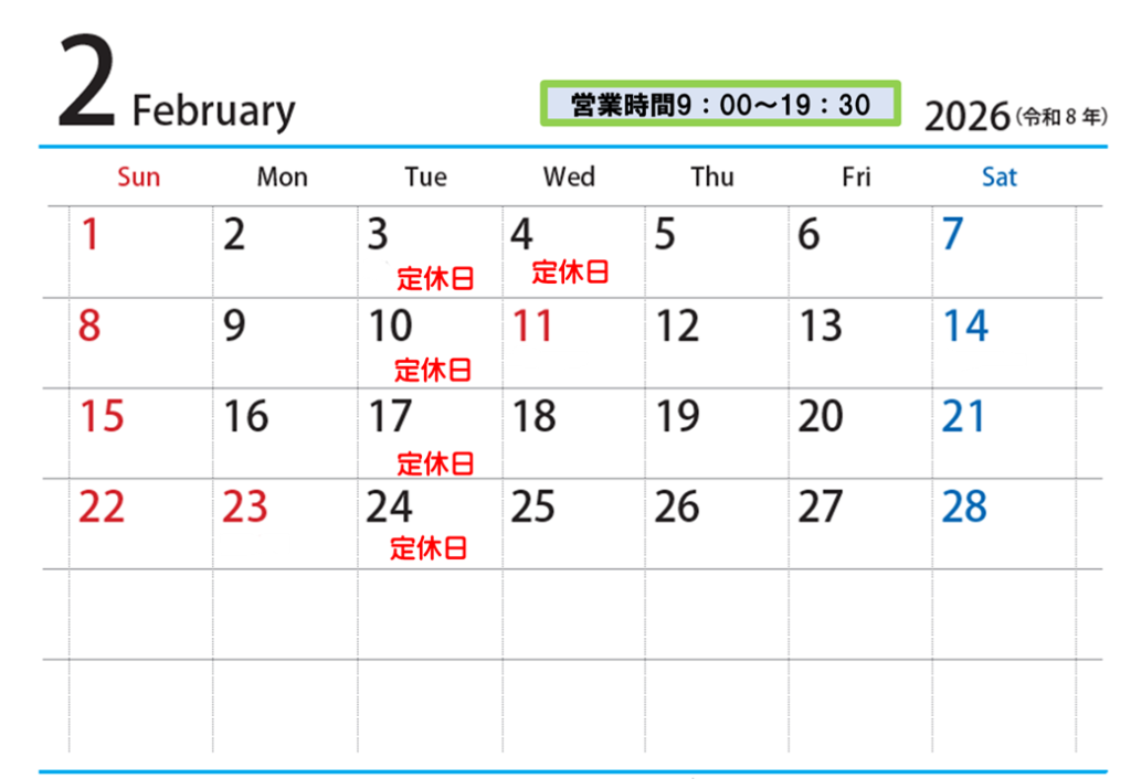 2月の営業カレンダーをお知らせいたします。