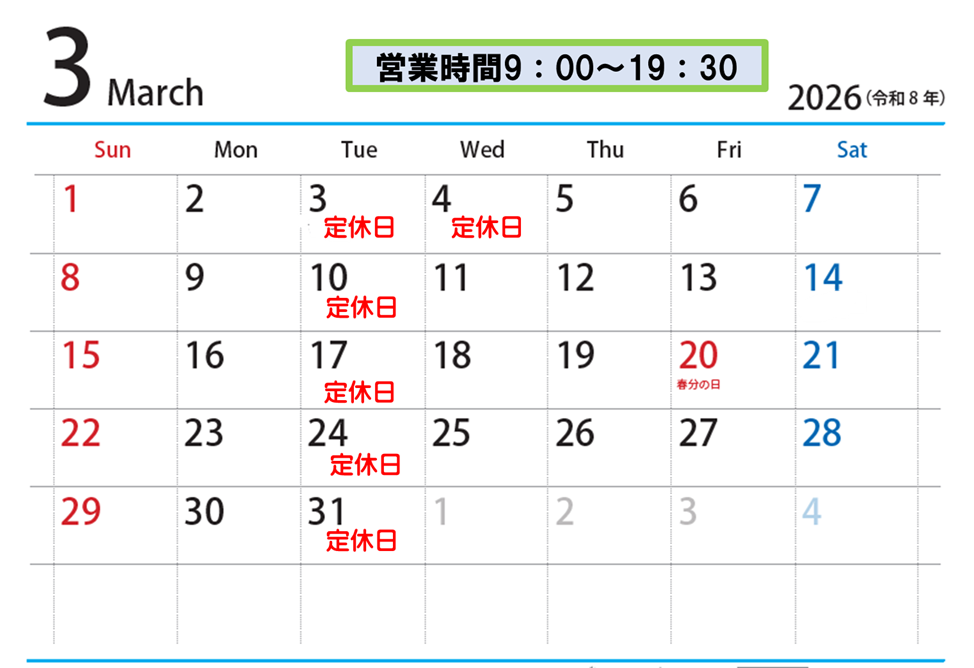 火曜日と第一水曜日に定休日をいただいておりますので、ご来店の際はご確認ください。