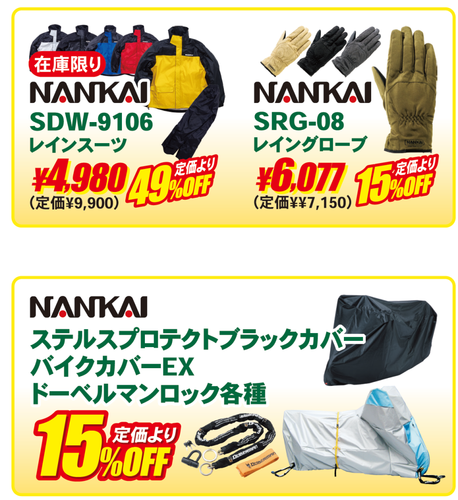 期間中は、ヘルメットやウェア、グローブなどの人気アイテムをお買い得価格でご用意。