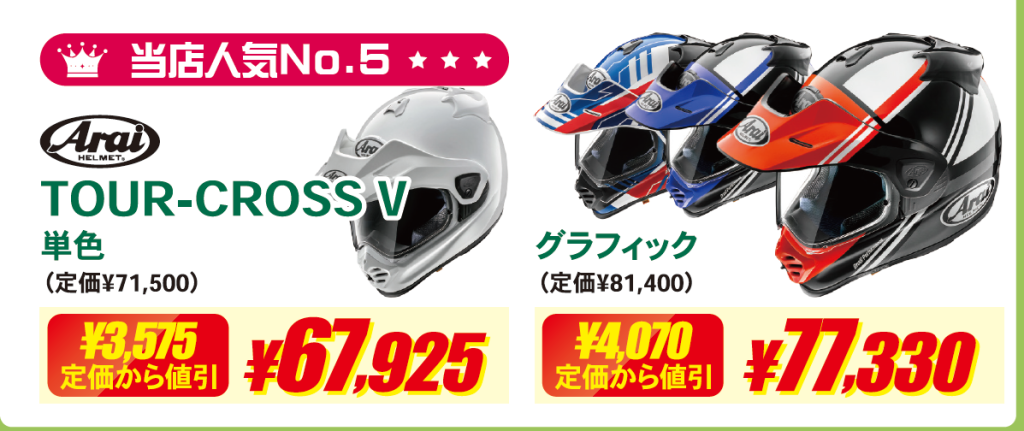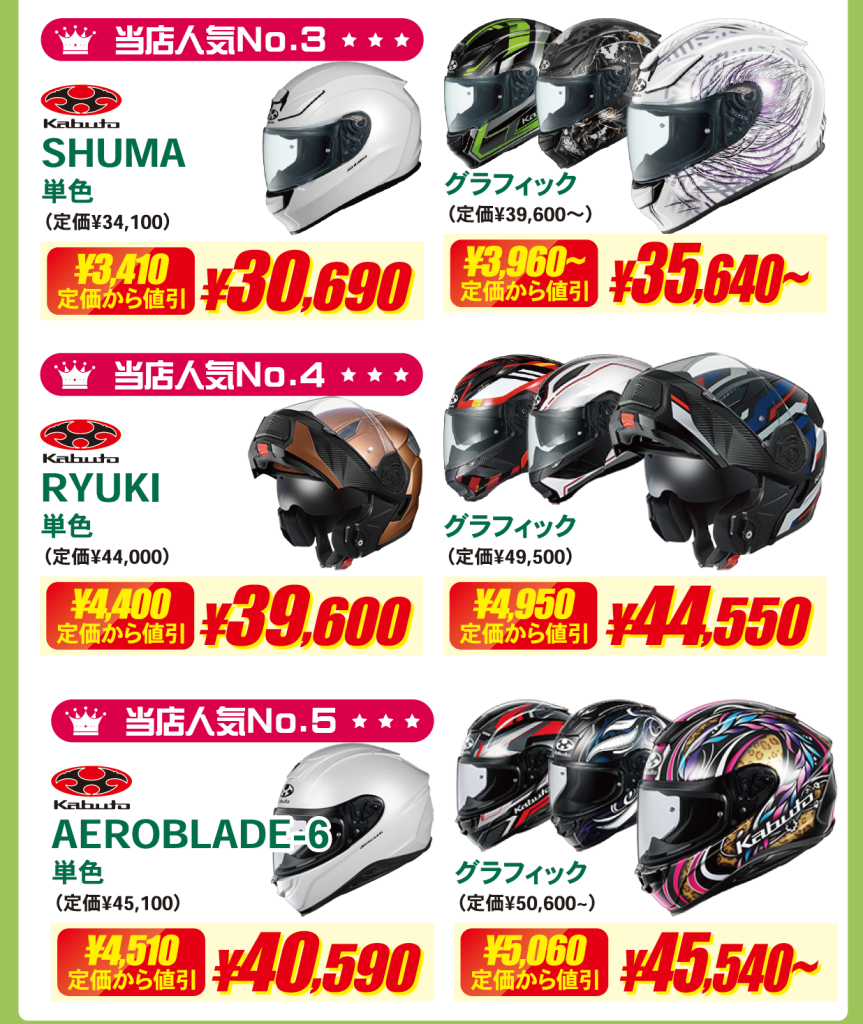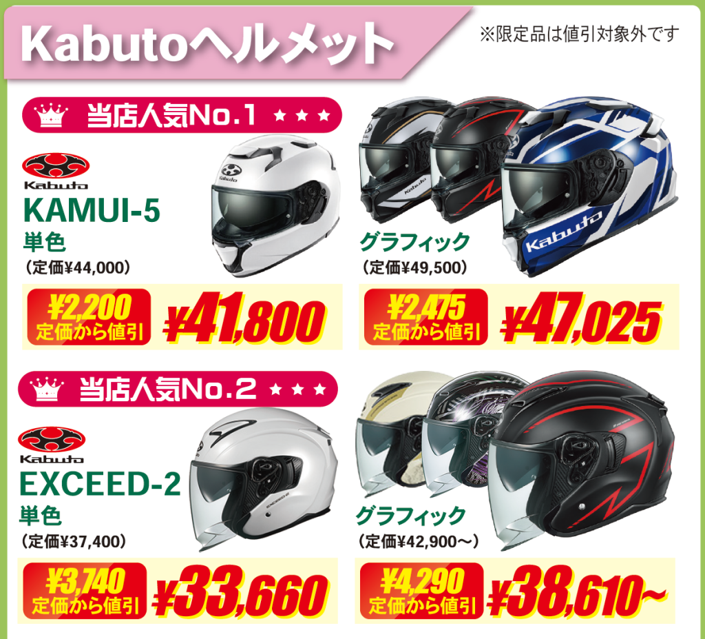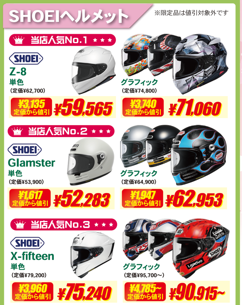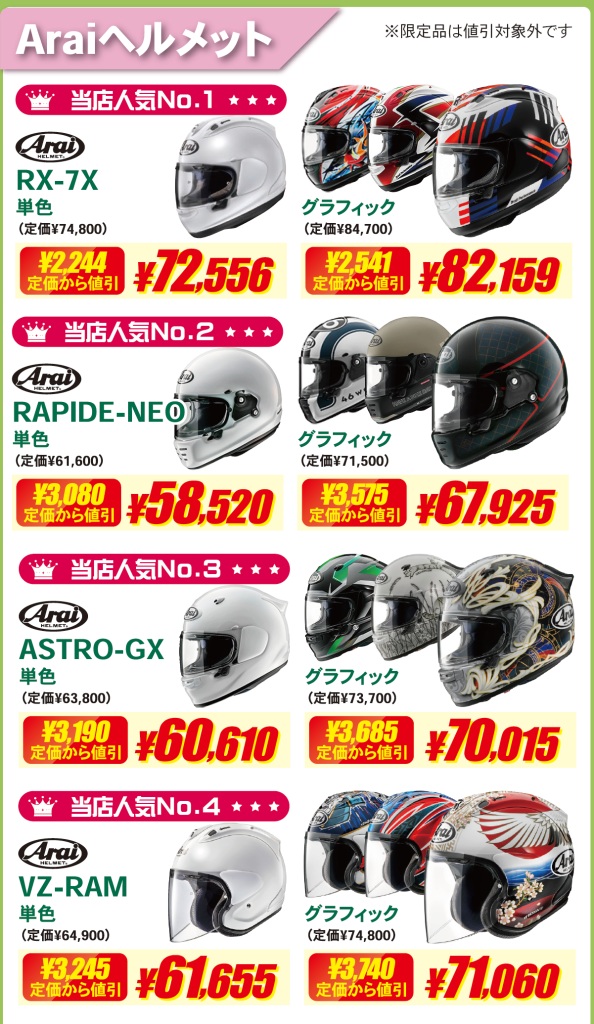 Arai・SHOEI・Kabutoなどの人気ヘルメットも特価でご案内。